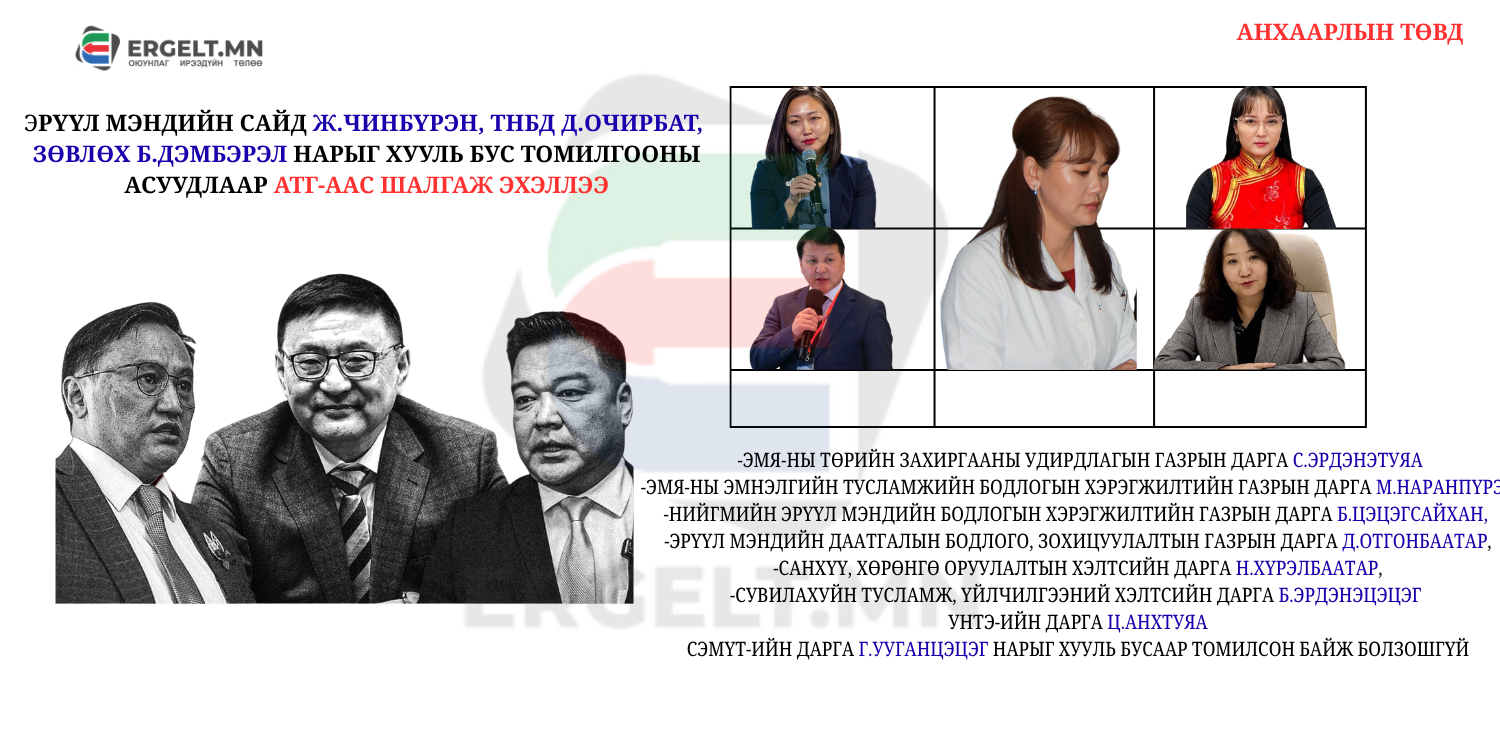 ЭРҮҮЛ МЭНДИЙН САЙД Ж.ЧИНБҮРЭН, ТНБД Д.ОЧИРБАТ, ЗӨВЛӨХ Б.ДЭМБЭРЭЛ НАРЫГ АТГ-ААС ШАЛГАЖ ЭХЭЛЛЭЭ