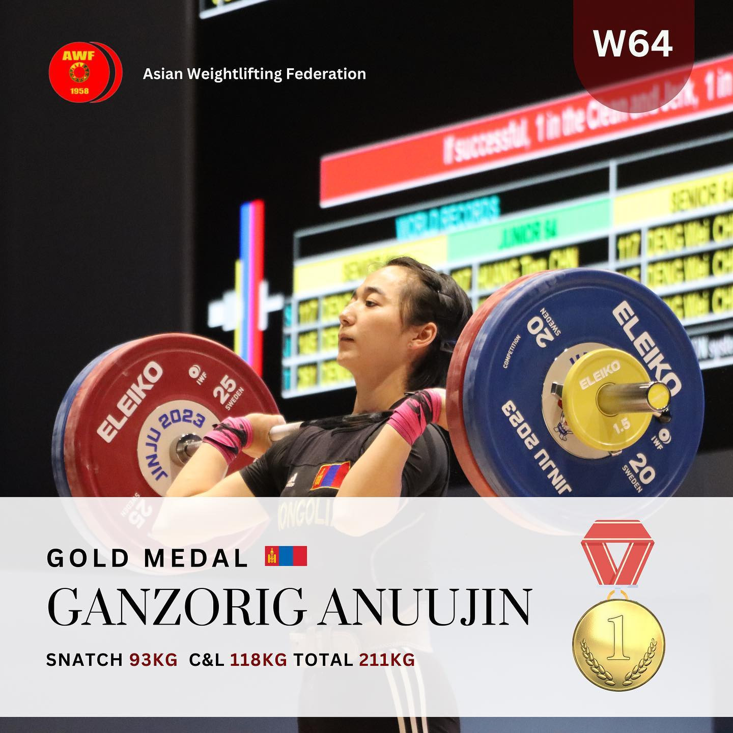 Харин Г.Ануужингийн сонгосон зам зөв байсан нь хүндийн өргөлтийн УАШТ-д долоон удаа түрүүлж, улсын рекордыг хэдэнтээ тогтоож, Азийн аваргаас алт, мөнгө, хүрэл медаль хүртсэн бахдам амжилтуудаас нь харагдана. Ялангуяа 2023 оны Азийн аваргын алтан медаль түүний хувьд хамгийн эрхэм, үнэ цэнтэй. Өмнөх жил нь тивийн аваргаас хүрэл медаль аваад байсан тул тэрхүү Азийн аваргын тэмцээнд “ногт ганзагалаж” очсон нь мэдээж. Улмаар арын тамирчнаасаа дөрвөн килограммын илүүтэйгээр өргөж, Азийн аваргаас алтан медаль хүртсэн юм.