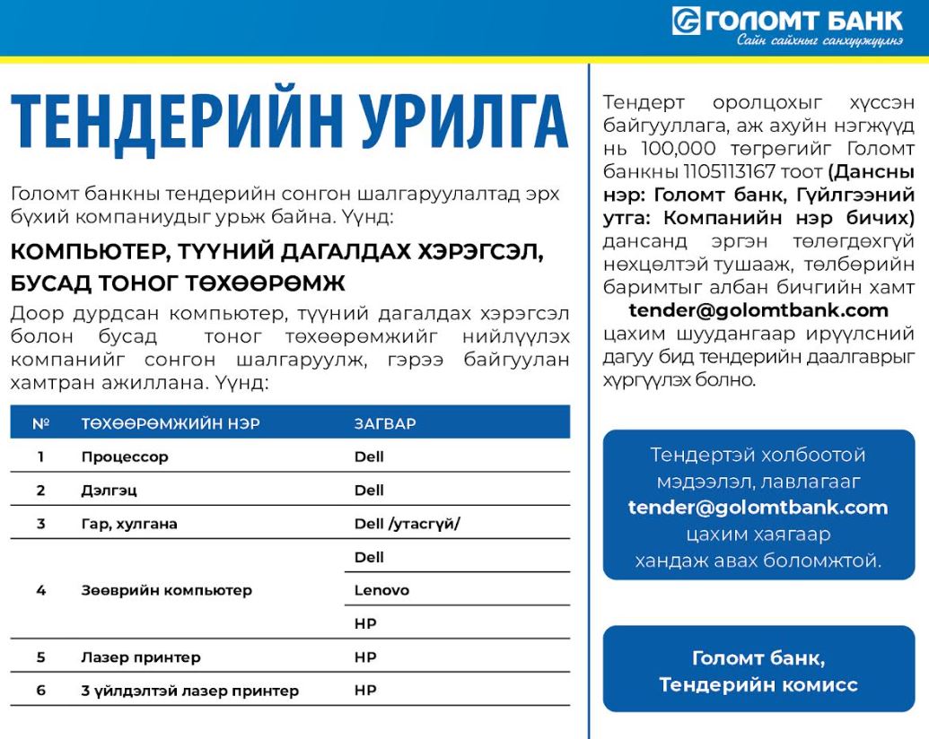 | Голомт банк: ТЕНДЕРИЙН УРИЛГА |