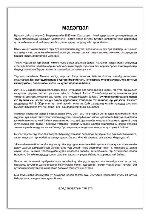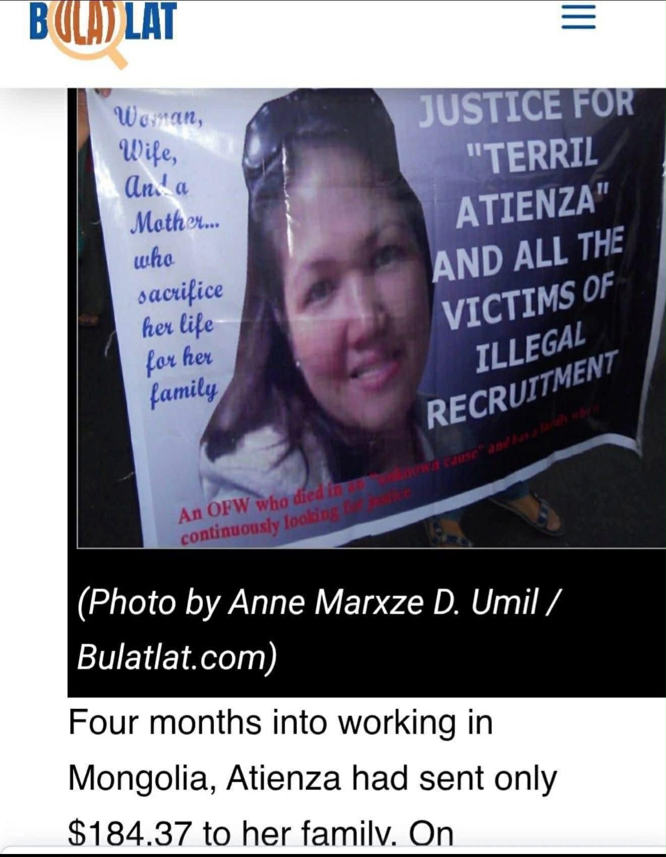 Одоогоос 13 жилийн өмнө УИХ-ын гишүүн асан Б.Эрдэнэбатын гэрийн үйлчлэгч Террил Атиенза гэх Филлипин эмэгтэй амиа алдсан харамсалтай хэрэг гарсан. Тухайн үед Шүүх шинжилгээний байгууллагаас түүний үхлийн шалтгааныг “Үл мэдэх хүчтэй зүйлд хордсон байна” гэх дүгнэлт гаргаж, 2011 оны арванхоёрдугаар сарын 9-нд цогцсыг нь ар гэрийнхэн рүү нь явуулсан байдаг. Харин Филлипин Улсын Шүүх шинжилгээний байгууллагынхан түүний цогцост дахин шинжилгээ хийж, “Зүрх судасны өвчин нь хүндэрч, зүрхээр нь хатгаснаас болж амиа алдсан байж болзошгүй” гэх дүгнэлт гаргаж байжээ. Гэхдээ цогцос шархадсан, түлэгдсэн байхаас гадна дотроос нь даавууны өөдөс гарч ирсэн гэх мэдээлэл гарч, хэсэг шуугиан тарьж байгаад өнгөрсөн. Харин түүний ар гэрийнхэн өөр ямар шалтгаанаар амиа алдсан нь тодорхойгүй энэ хэрэг дарагдсан байдаг. Харин Террил Атиензагийн ар гэрийнхэн түүний үхлийн шалтгааныг тодорхой болгож чадалгүй өнөөдрийг хүрсэн байдаг. Саяхан сэтгүүлч Б.Будрагчаа дээрх сэдвийн хүрээнд талийгаачийн ар гэрийнхэнтэй уулзаж, “Боолчлогч” гэх нэвтрүүлэг бэлтгээд ирсэн. Нэвтрүүлгийн үр дүнд талийгаач эмэгтэйн нөхөр, хоёр охиныг нь Монголд авчирсан. Талийгаачийн ар гэрийнхэн хэргийг дахин сэргээж, нотлох баримттай танилцах хүсэлтээ хуулийн байгууллагад өгчихөөд байгаа. Хэрвээ амиа алдсан үйлчлэгч Террил Атиензагийн хэргийг сэргээвэл гэрчүүдээс мэдүүлэг авч, нотлох баримт цуглуулж эхлэх ажил хуулийн байгууллагынханд үүснэ гэсэн үг.