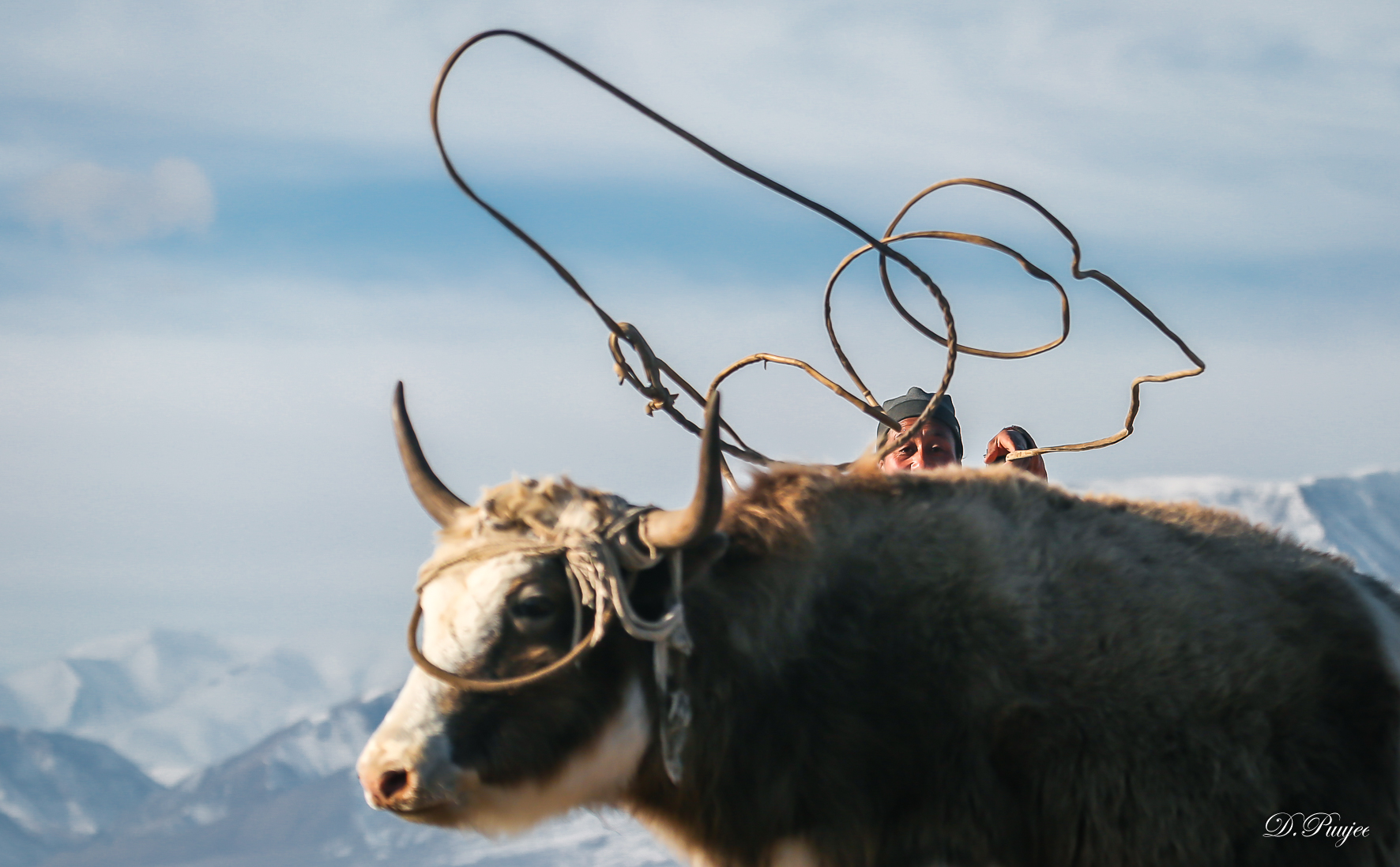 -Ялгаатай байлгүй яах вэ. Сарлагийн толгойд төдийлөн бугуйл ороод байдаггүй юм. Зураг авах үеэр аз нь таарсан юм байлгүй хэд хэд хаяахад гайгүй ороод байсан. Харин адууны толгойнд суран бугуйл гайгүй тогтдог. Манайхан малаа заримдаа хашиж, заримдаа хурааж байгаад барьдаг.